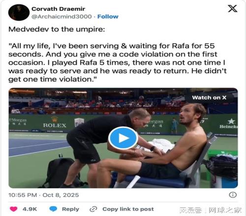 在被判违规后,梅德韦杰夫当场反击,提起自己与纳达尔交手的往事。他认为纳达尔在比赛中总是让对手等待,但从未因此受到处罚,而他却在上海第一次就被判违规。他当面指责主裁“疯了”,对判罚极为不满。
