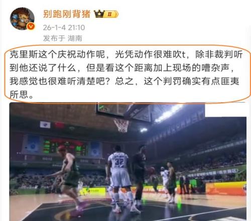 针对此事,CBA篮球记者“别跑刚背猪”,也是进行了点评,他表示从克里斯的动作来看, 很难给他吹一个技术犯规,也许他是说了一些什么,但是现场很吵也很难听清楚,总之,裁判的这个吹罚,有点匪夷所思。